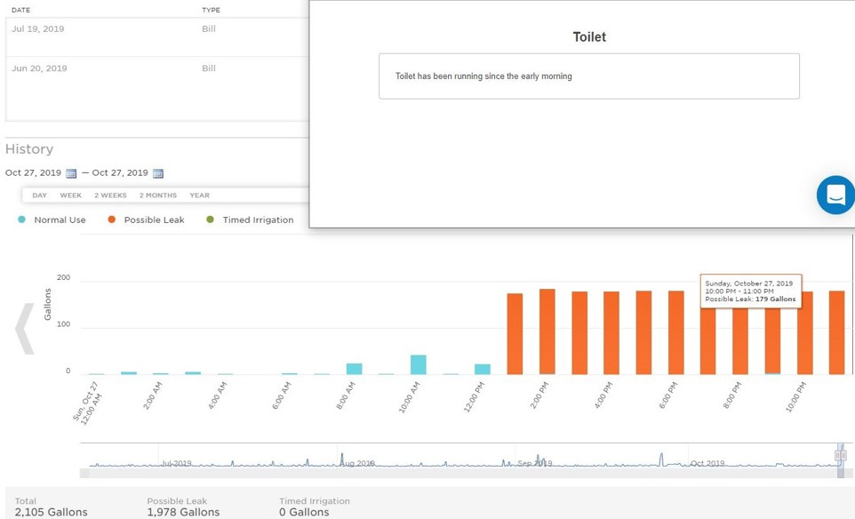 The data helps customers identify problems quickly, such as irrigation systems running too long or leaks they might not notice otherwise. This reduces both water loss and unexpected charges. The system even sends automatic leak alerts when it detects continuous flow, allowing customers to act before water and money are lost. Toilets, for example, are often the biggest culprit; a single running toilet can waste up to 200 gallons per hour.
