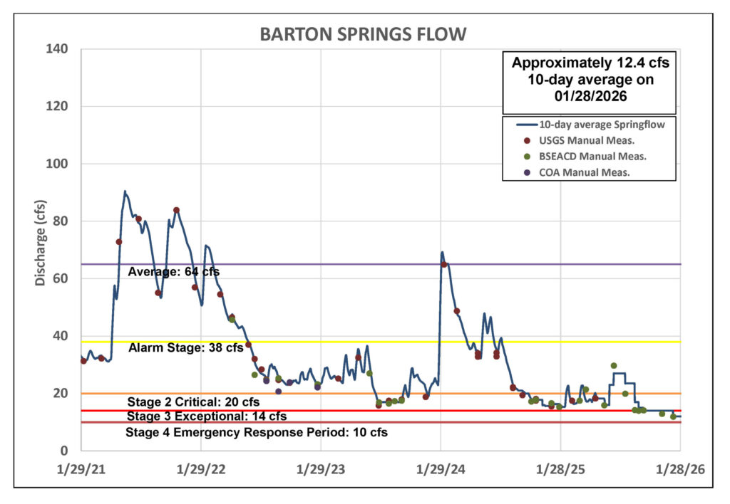 If current dry conditions persist, groundwater levels at the Lovelady Monitor Well could cross the threshold for Stage 4 ERP declaration as soon as late March. Barton Springs flow is currently less than a quarter of its historical average. A new drought stage is triggered when either indicator falls below its set threshold. Both indicators must recover above their thresholds before the aquifer can exit a drought stage.