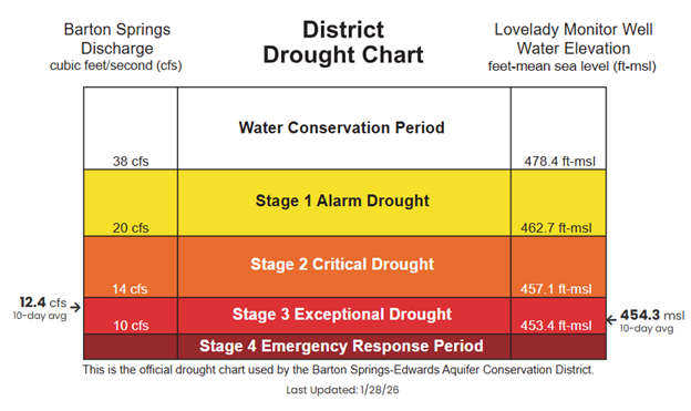 The District’s Drought chart with current Barton Springs flow on the left and Lovelady water levels on the right.