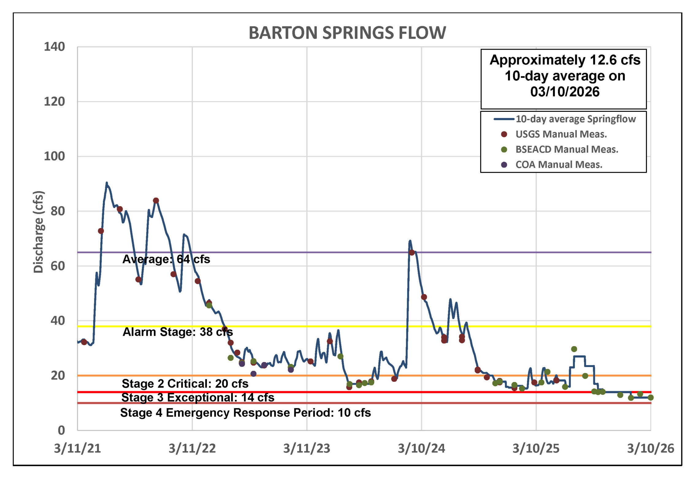 As of March 10, the 10-day average flow at Barton Springs is 12.6 cubic feet per second (cfs) – just 2.6 cfs above the Stage 4 Emergency Response threshold (Figure 2). The District obtained a manual flow measurement on March 10. The District has never reached Stage 4 Emergency Response, but without meaningful rainfall, Barton Springs flow could drop into that range before spring 2026.