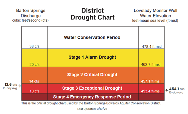 Figure 2. District Drought Chart as of 3/10/2026 displaying 10-day averages for springflow at Barton Springs (left) and groundwater levels at Lovelady monitor well (right)—both of which play a role in determining the District’s drought stage.