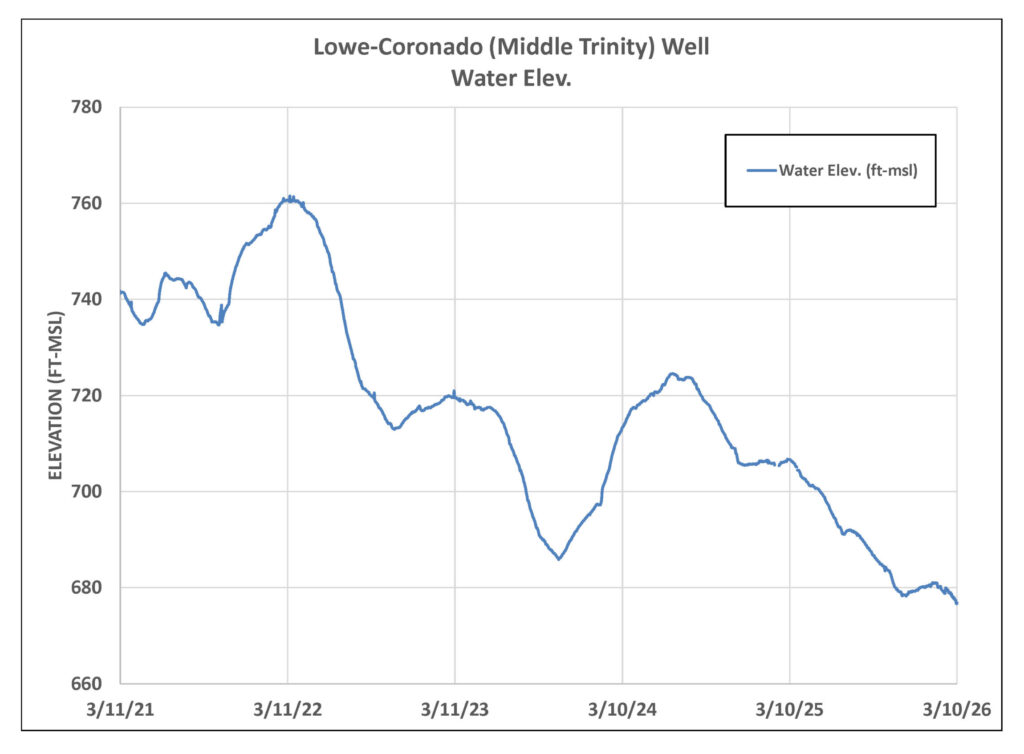 The Lowe-Coronado Middle Trinity monitor well continues to show a steep decline in groundwater levels, reaching new lows (Figure 4). This downward trend mirrors conditions across the region, including in the overlying Upper Trinity Aquifer.