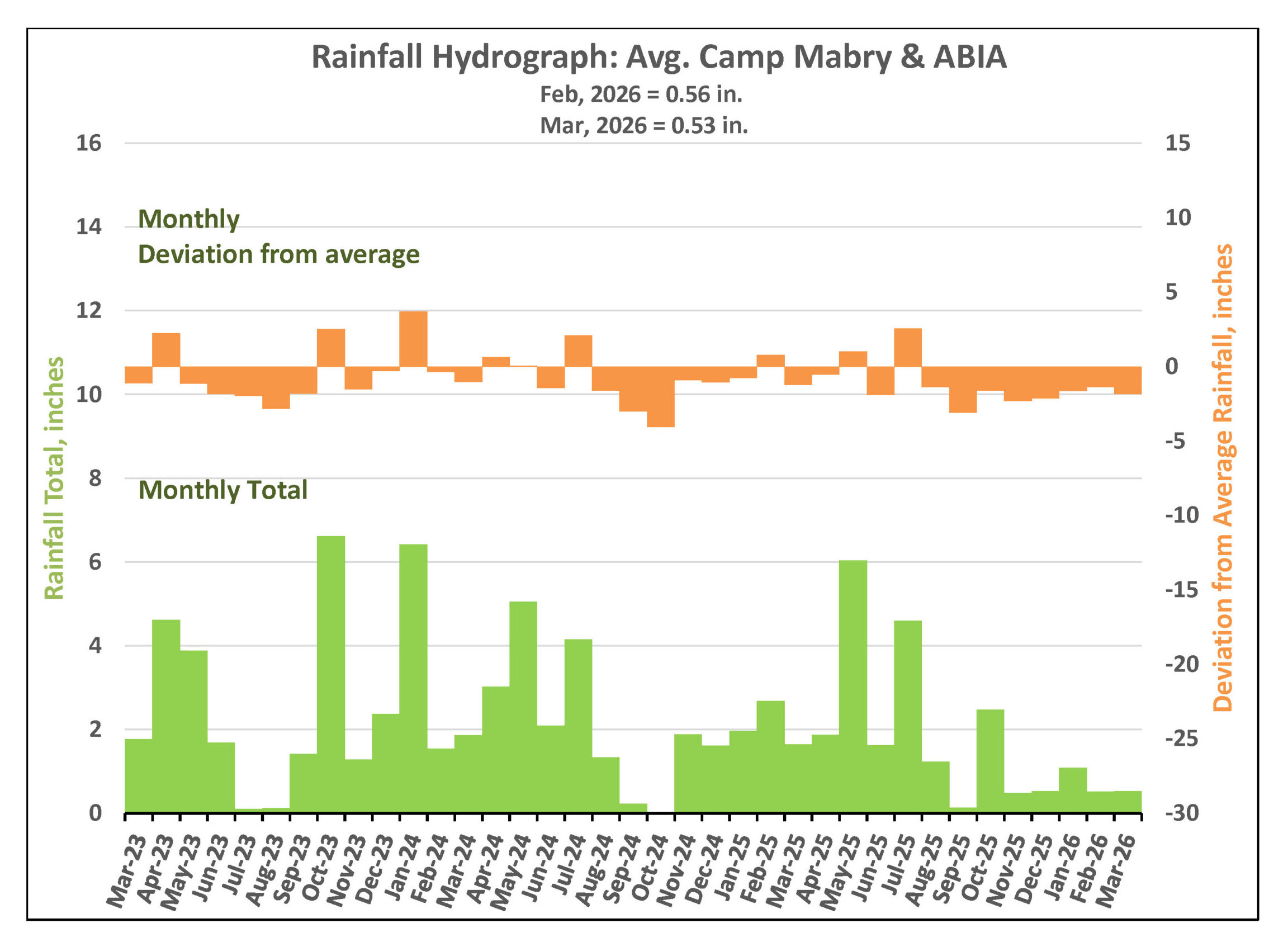 Total February rainfall in the Austin-Hill Country area saw an average of just 0.56 inches between Camp Mabry and ABIA, about 1.4 inches below the monthly long-term average (Figure 1). Looking ahead, March typically brings about 2.9 inches of rain. Through March 10 we’ve received 0.53 inches.