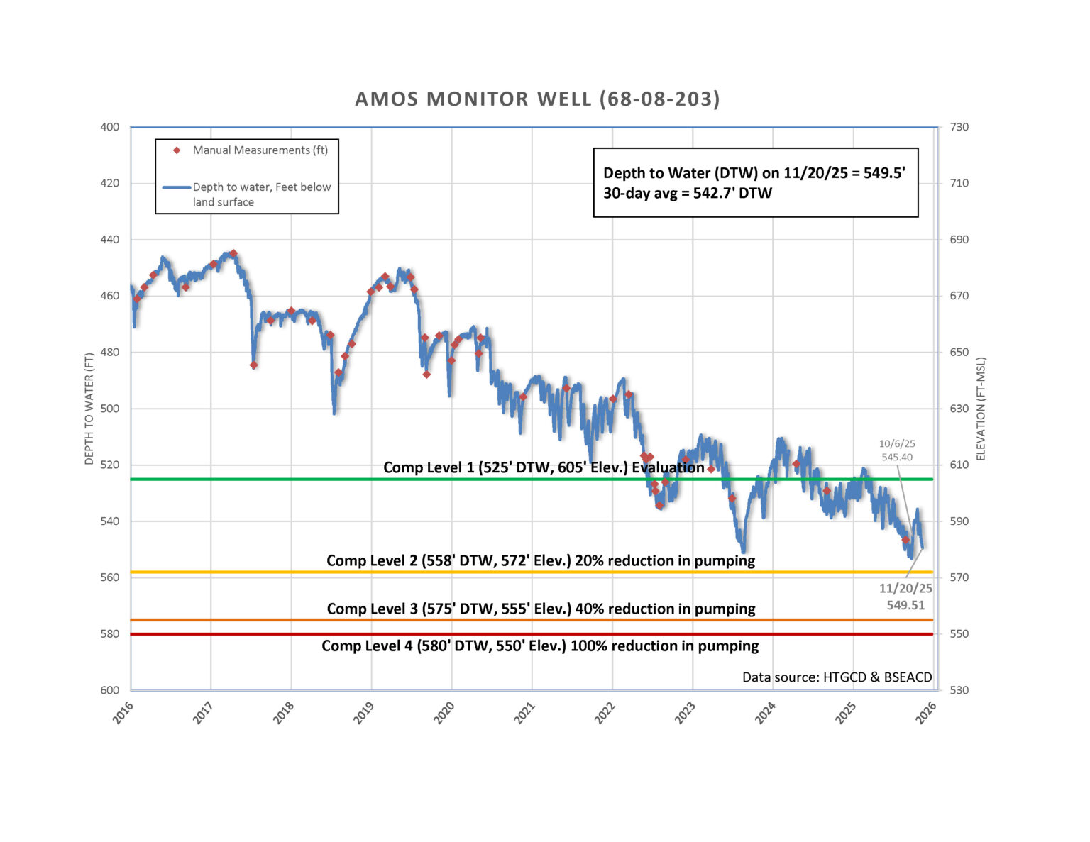 The District monitors continuous water levels of the Amos well and has done so since summer 2019. The Amos well serves as the index well for the Needmore permit. It was continuously monitored by the Hays Trinity Groundwater Conservation District (HTGCD) from winter 2015 to summer 2019.